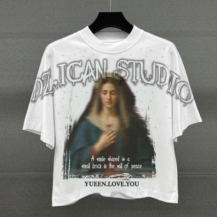 Leading supplier of custom rhinestone printed graphic t-shirts. We specialize in trendy boxy fit and drop shoulder styles, featuring high-quality rhinestone embellishments and vibrant prints. Crafted from soft, durable fabrics for maximum comfort. Perfect for streetwear brands, boutiques, and events. OEM/ODM services welcome. Competitive wholesale pricing and fast global shipping available.