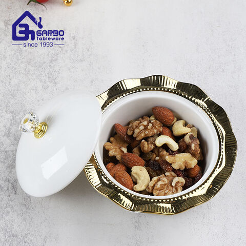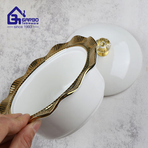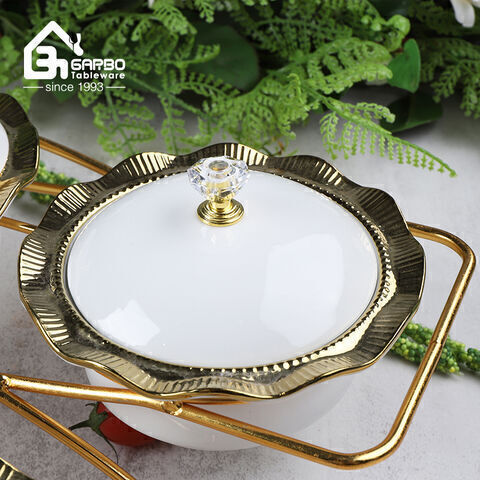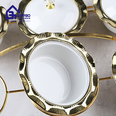 Этот комплект из шести частей по керамике оснащен художественной золотой металлической рамкой. Белый фарфор с золотым украшением спроектирован, чтобы стать мгновенным рабочим столом в центре, когда его размещают.